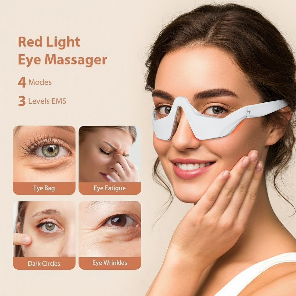 Our LED Eye Massager uses advanced red light therapy to stimulate collagen production and reduce dark circles. It's designed to relax eye muscles and promote a soothing experience, helping you look revitalized and awake.